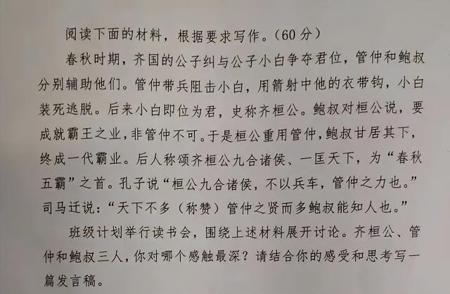 班级计划举行读书会,围绕上述材料展开讨论。齐桓公、管仲和鲍叔三人,你对哪个感触最深?请结合你的感受和思考写一篇发言稿。